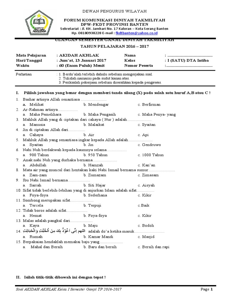 Pendidikan agama merupakan salah satu pilar penting dalam membentuk karakter anak sejak usia dini. Di tingkat Sekolah Dasar (SD), mata pelajaran Akidah Akhlak memegang peranan krusial dalam menanamkan dasar-dasar keimanan dan budi pekerti luhur. Khususnya bagi siswa Kelas 1 Semester 2, pemahaman mereka terhadap konsep-konsep dasar Akidah Akhlak akan diukur melalui Ujian Tengah Semester (UTS). Artikel ini akan mengupas tuntas mengenai jenis-jenis soal, kisi-kisi materi, serta strategi menghadapi soal UTS Akidah Akhlak Kelas 1 Semester 2 agar siswa dapat menjawabnya dengan percaya diri dan mendapatkan hasil yang optimal.